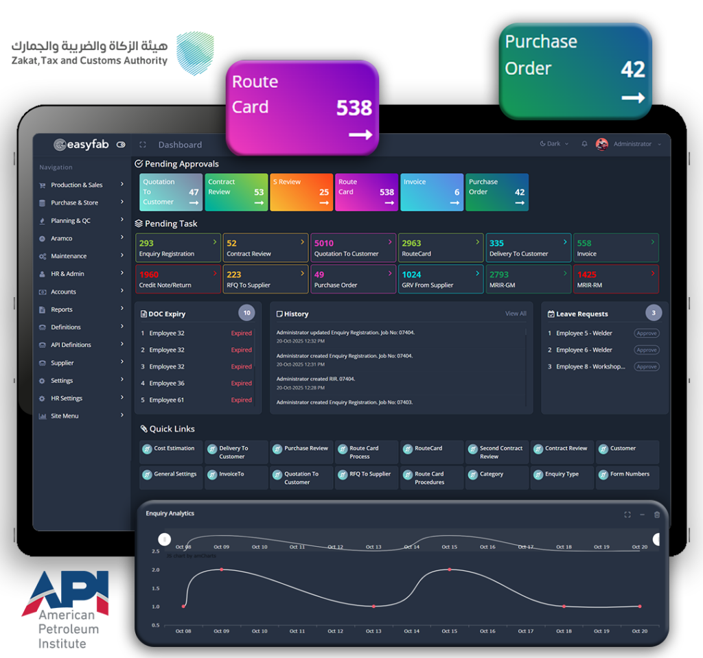 Built for regulated fabrication environments. Supports API-aligned workflows and ZATCA Phase-2 compliant e-invoicing for UAE & KSA.